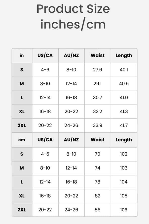 | Size | US/CA | AU/NZ | Waist | Length |
