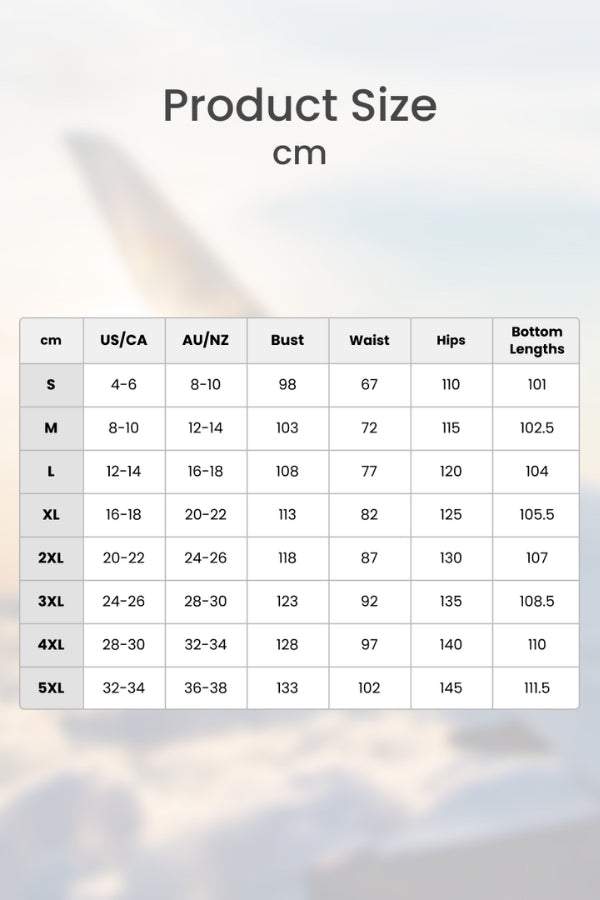 | Size | US/CA | AU/NZ | Bust | Waist | Hips | Bottom Length |
