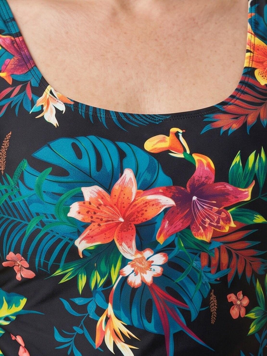 Style: Works for beach, pool, resort, and cruise. The solid black bottom pairs cleanly with all available prints. Straps adjust at the back for a custom fit.